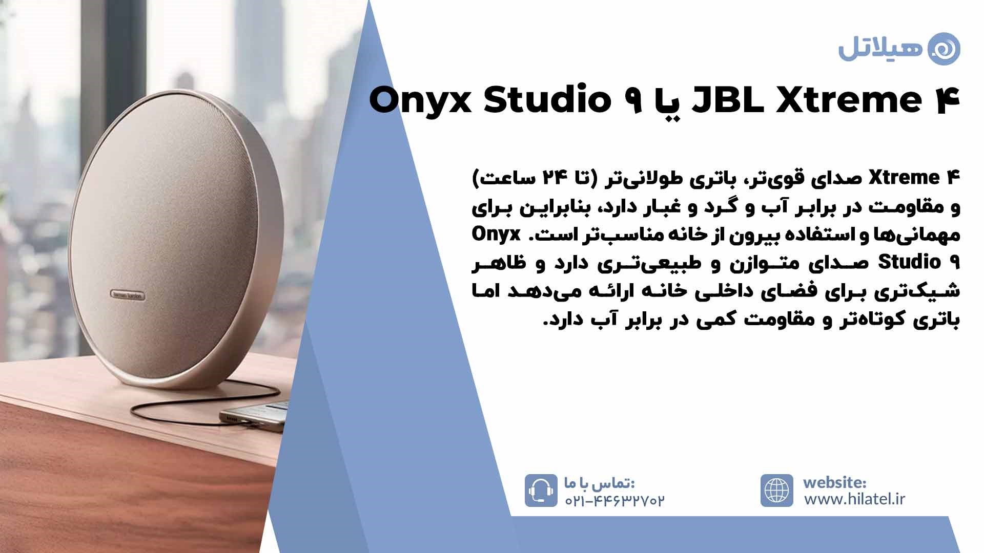 - JBL Xtreme 4 صدای بلندتر و باس قویتر دارد و مناسب مهمانیهاست. Onyx Studio 9 صدای متعادل و شفاف دارد اما توان خروجی و حجم صدا کمتر از Xtreme 4 است.