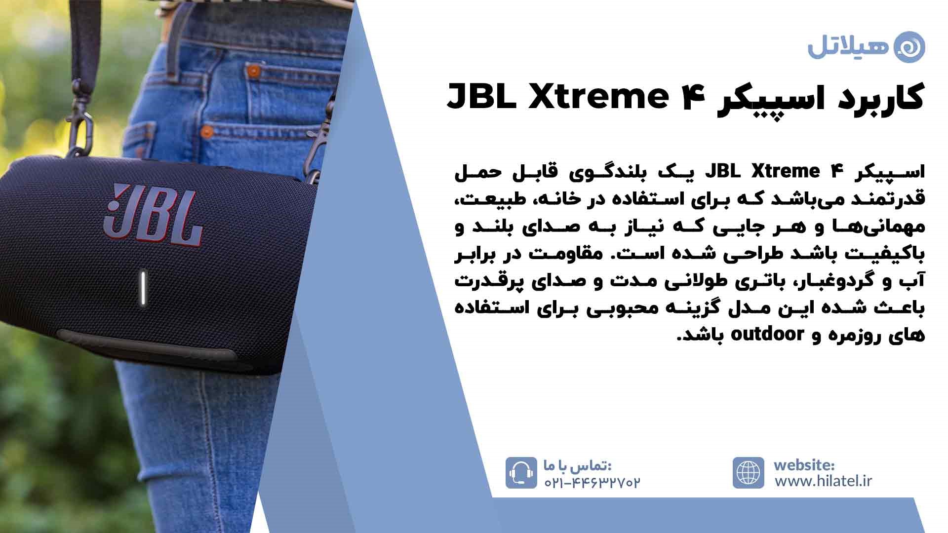 اسپیکر JBL Xtreme 4 یک بلندگوی قابل حمل قدرتمند میباشد که برای استفاده در خانه، طبیعت، مهمانیها و هر جایی که نیاز به صدای بلند و باکیفیت باشد طراحی شده است. مقاومت در برابر آب و گردوغبار، باتری طولانی مدت و صدای پرقدرت باعث شده این مدل گزینه محبوبی برای استفادههای روزمره و outdoor باشد.