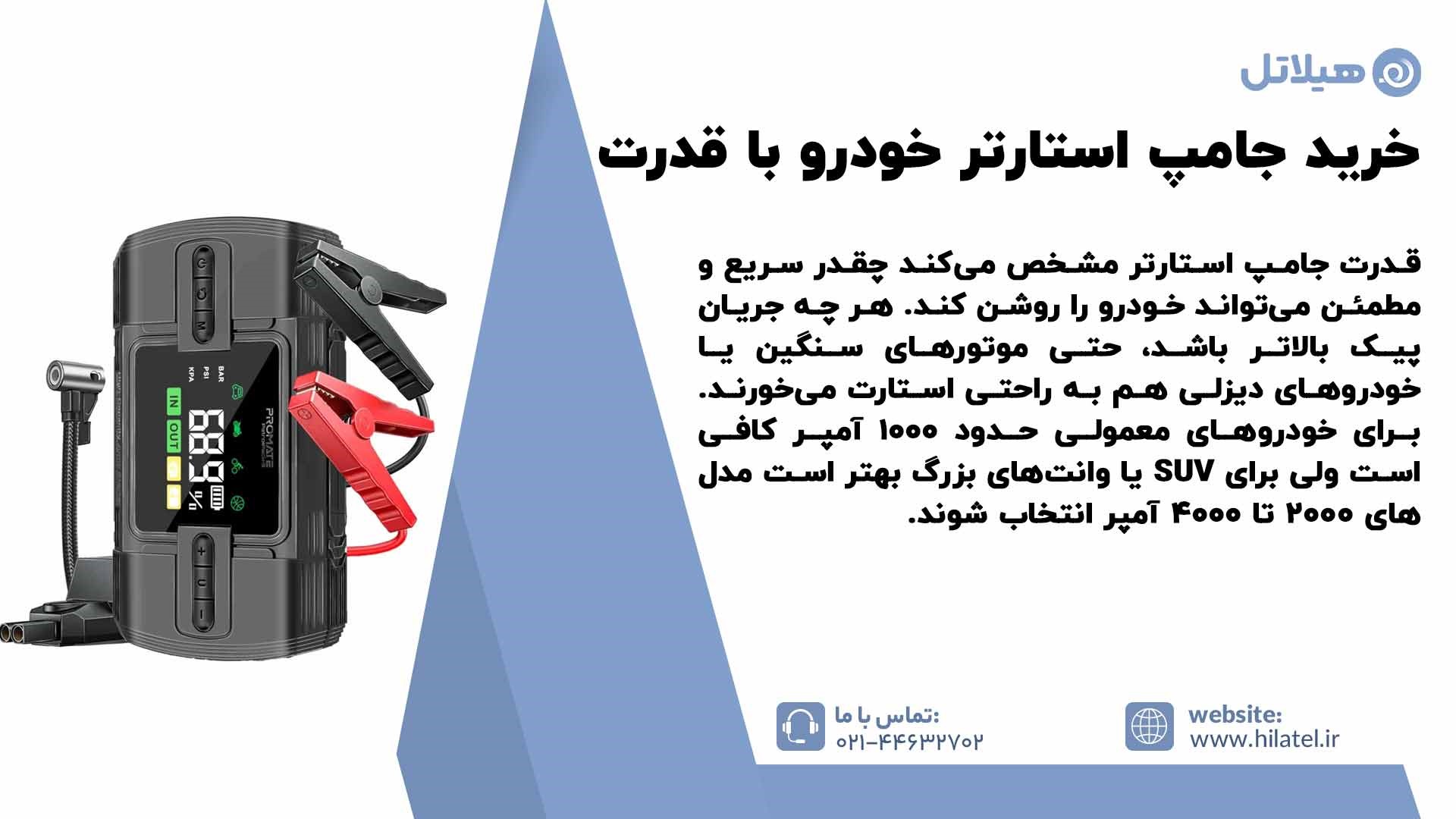 قدرت جامپ استارتر مشخص میکند چقدر سریع و مطمئن میتواند خودرو را روشن کند. هر چه جریان پیک بالاتر باشد، حتی موتورهای سنگین یا خودروهای دیزلی هم به راحتی استارت میخورند. برای خودروهای معمولی حدود ۱۰۰۰ آمپر کافی است ولی برای SUV یا وانتهای بزرگ بهتر است مدلهای ۲۰۰۰ تا ۴۰۰۰ آمپر انتخاب شوند.