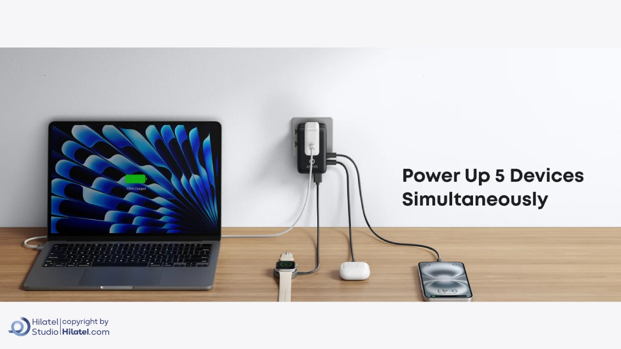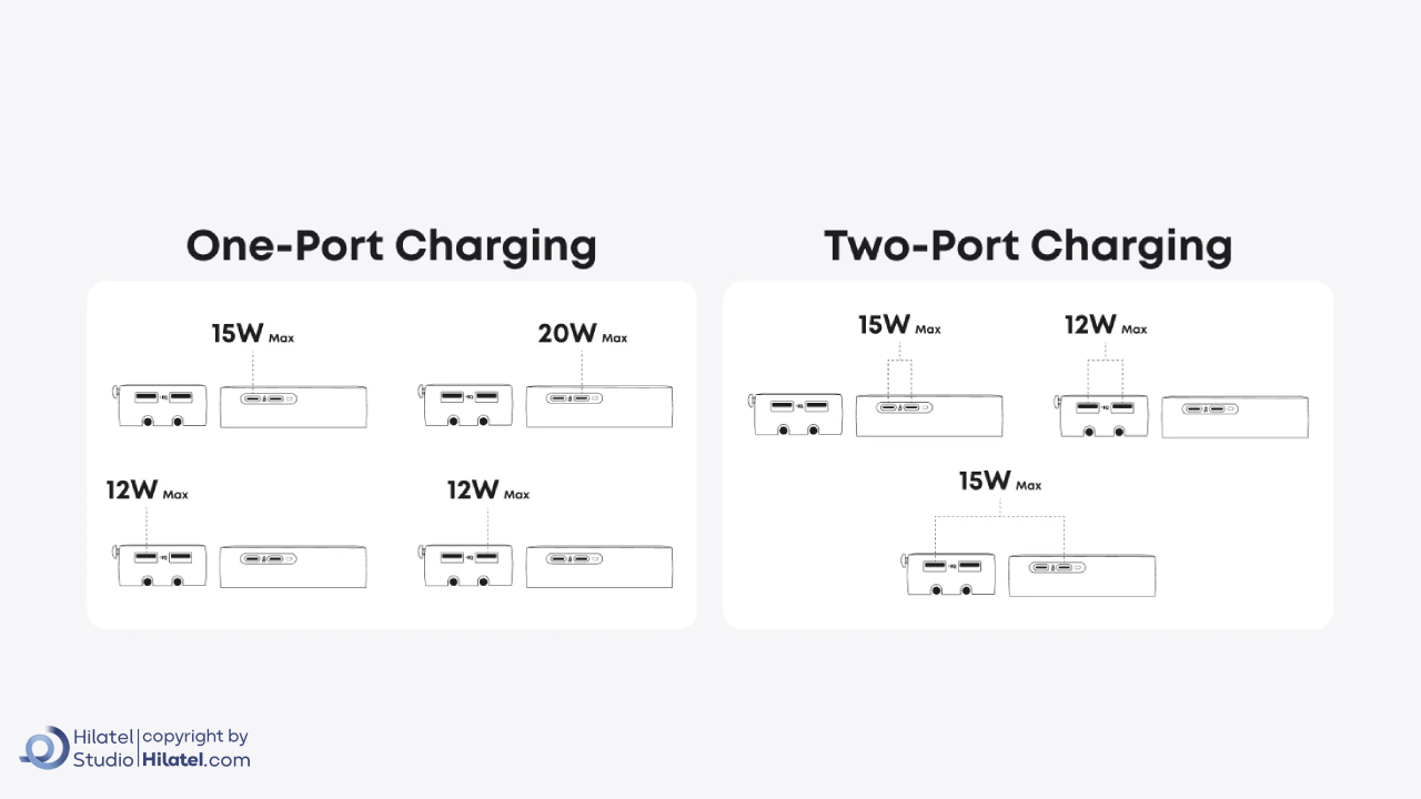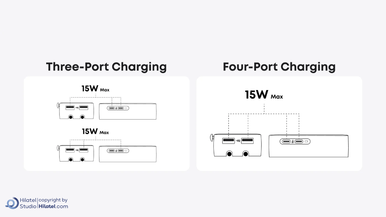 این محصول دارای دو پورت USB-C، دو پورتUSB-A و یک خروجی AC است.