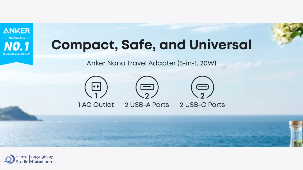 اقلام درون جعبهآداپتور Anker Nano Travel Adapter (5-in-1, 20W) /دفترچه راهنما /گارانتی ۱۸ ماهه خدمات پشتیبانی مشتری