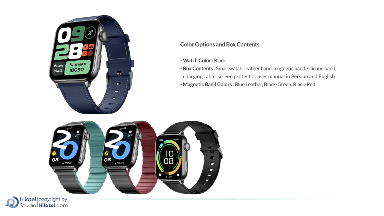 همچنین بند مگنتی ساعت نیز به رنگ های چرمی آبی، مشکی-سبز، مشکی-قرمز هستند.