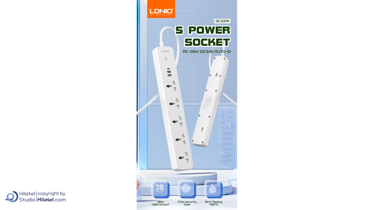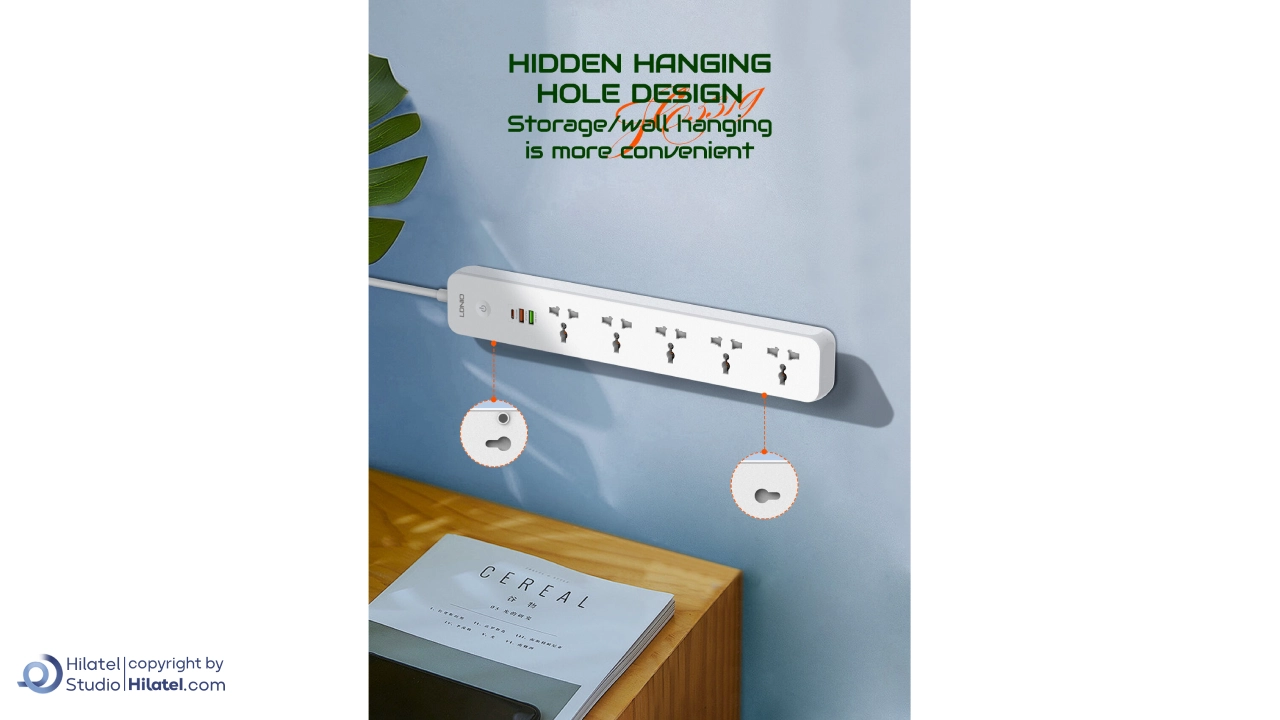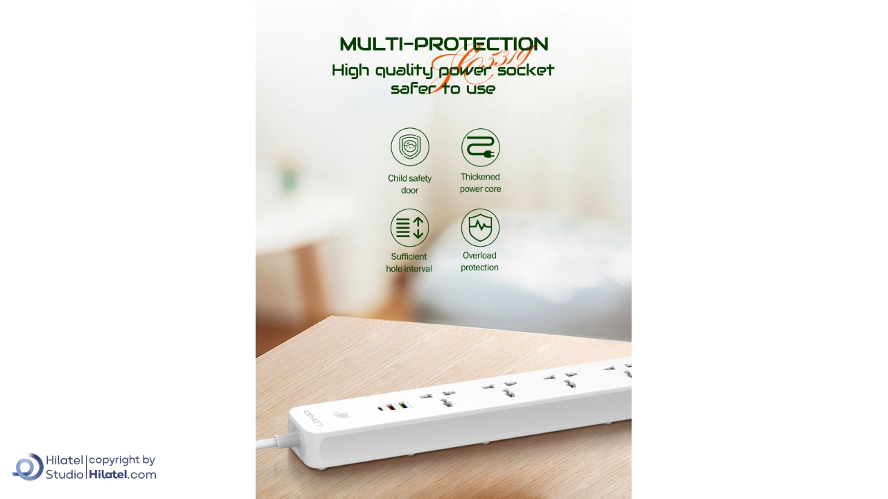 سایر ویژگی هاطراحی مینیمال و مقاوم در برابر ضربه/ امکان نصب روی دیوار یا آویزان کردن (Hidden Hanging Hole Design)/ فاصله کافی بین پریزها برای اتصال همزمان چند دستگاه/ چندلایه محافظت (Multi-Protection)