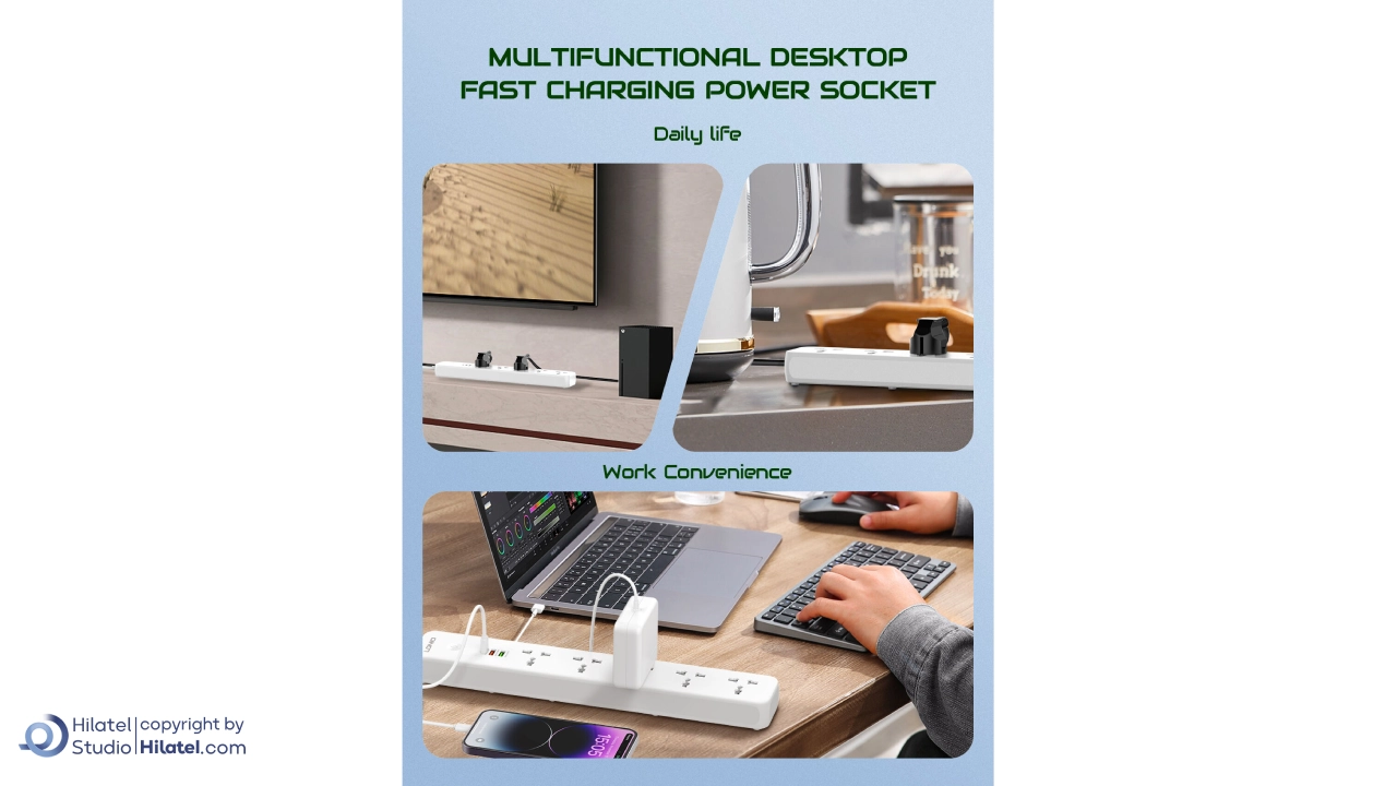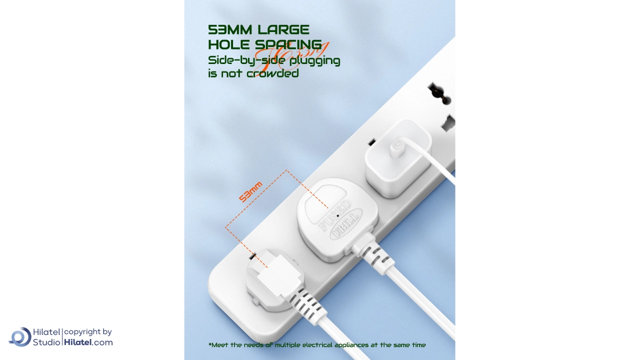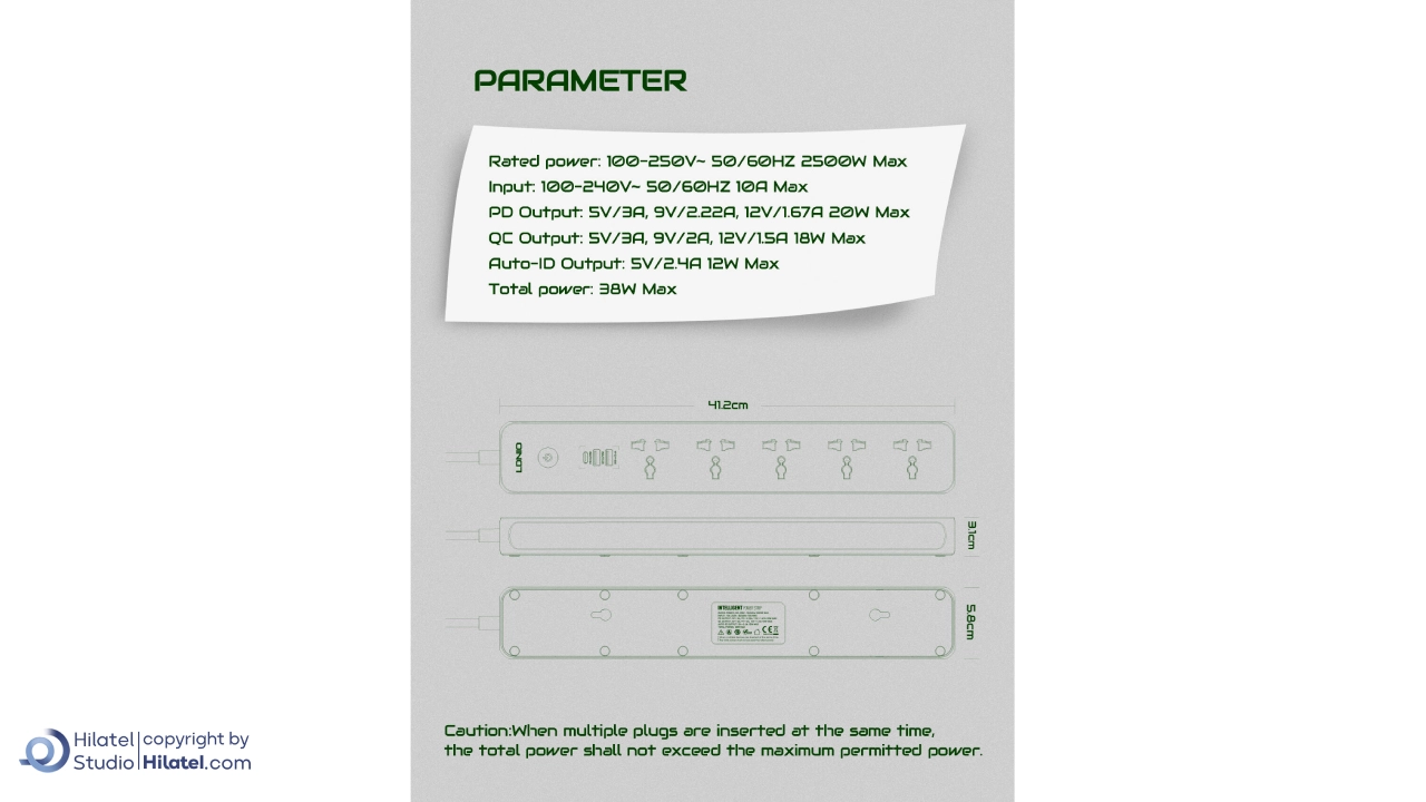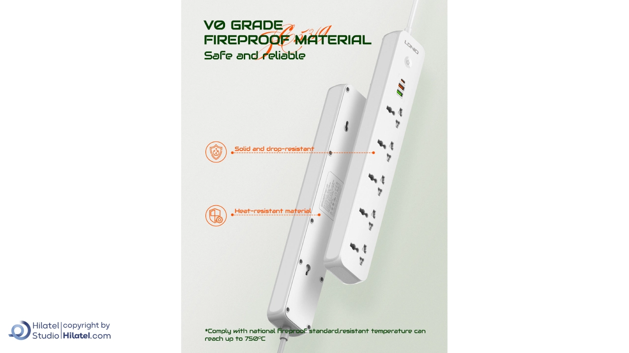 سایر ویژگی هاطراحی مینیمال و مقاوم در برابر ضربه/ امکان نصب روی دیوار یا آویزان کردن (Hidden Hanging Hole Design)/ فاصله کافی بین پریزها برای اتصال همزمان چند دستگاه/ چندلایه محافظت (Multi-Protection)