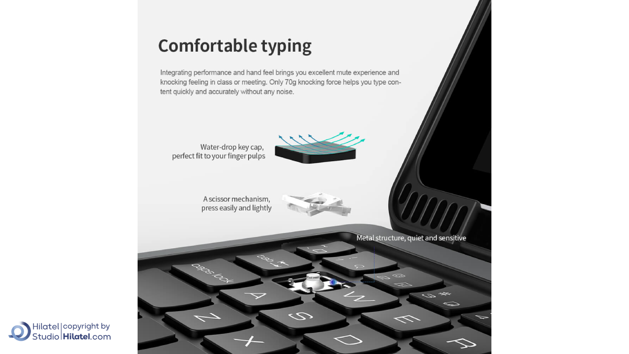کلیدهای قطره ای شکل با نیروی 70 گرمی، تجربه ای دقیق، سریع و بدون صدا هنگام تایپ در کلاس یا جلسه فراهم می کنند. ساختار فلزی و مقاوم کلیدها، ترکیبی از دوام و راحتی لمس است.